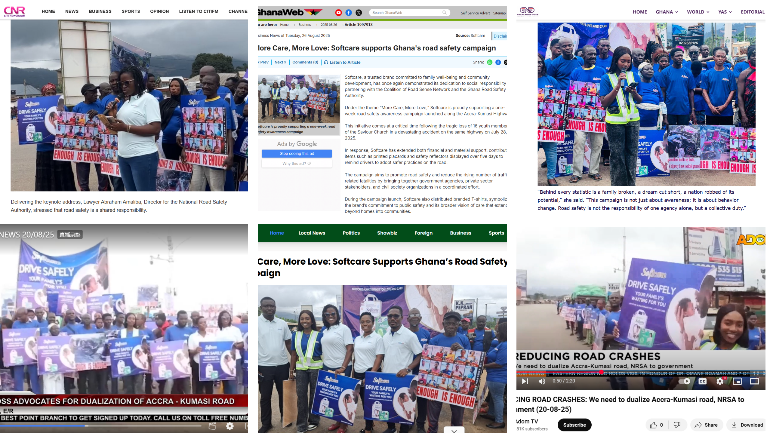 除此之外,Adom TV、Onua TV、UTV Ghana等地方电视台亦对活动进行直播报道,并在节目中对乐舒适加纳分公司此次“出资出力”举办安全教育活动表达了一致赞誉。